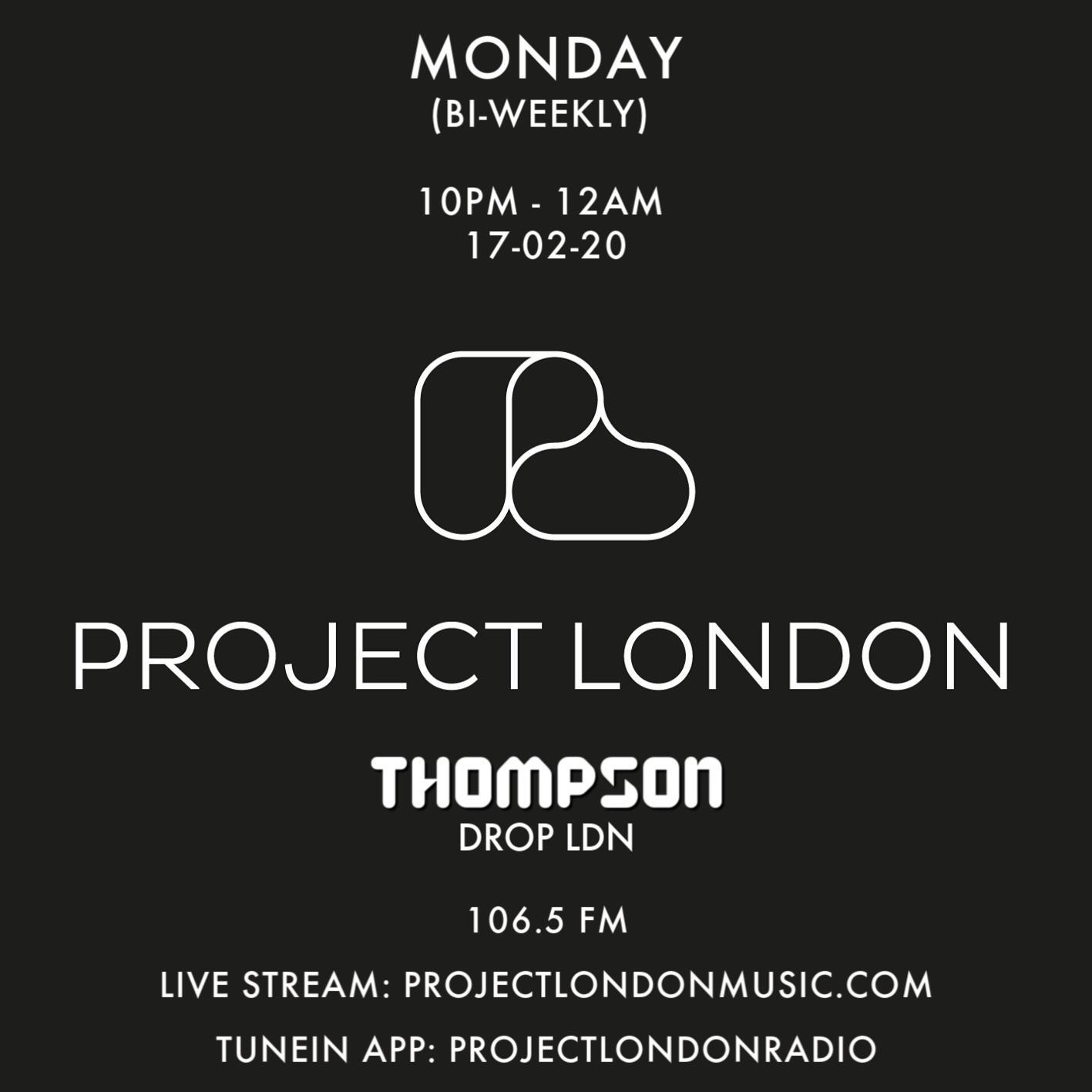 Thompson Live (Drop LDN) Live Radio Session Monday 17 February Time : 10pm - 12am On Radio : 106.5 FM Live stream (in-studio): projectlondonmusic.com TuneIn App: ProjectLondonRadio